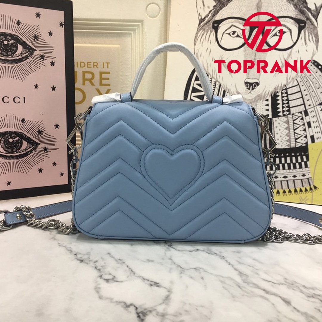 | Exterior del bolso | Bolso de mano de cuero Matelasse Chevron azul claro con herrajes plateados, asa superior plana única, solapa abatible con hebilla magnética GG entrelazada, un patrón de corazón en la parte posterior, correa de hombro Link Chian con hombro de cuero Pad. |