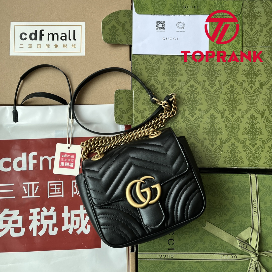 The GG Marmont has become synonymous with the House, thanks to its recognizable matelassé fabric and Double G hardware. Continuously reinvented through the seasons, new shapes are introduced within this signature line, matching Gucci's contemporary vision. Here, it's presented in black leather and further enriched with antique gold-toned details.